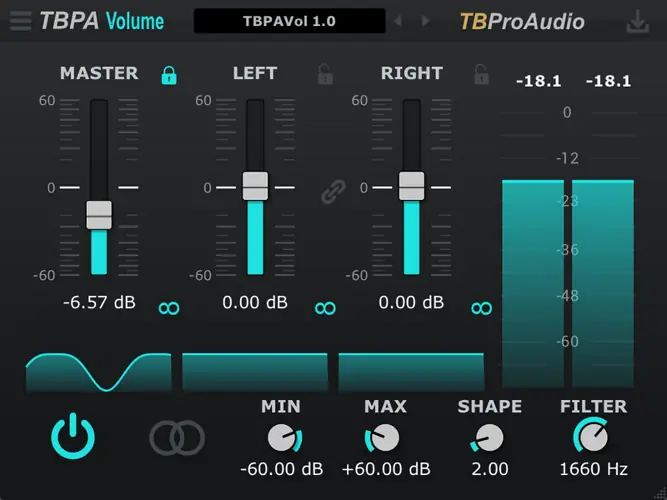 TBPA Volume allows you to control the volume of the audio signal independently from the volume fader of the mix console. This is useful for adjusting the gain/volume between different plug-ins within a plug-in chain or for volume modulation/automation.